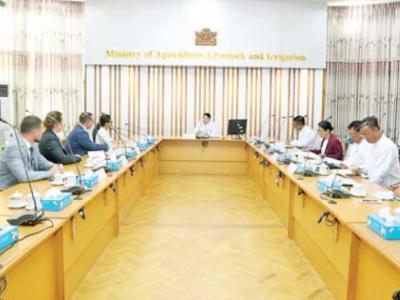 စိုက်ပျိုးရေး၊ မွေးမြူရေးနှင့်ဆည်မြောင်းဝန်ကြီးဌာန ဒုတိယဝန်ကြီး ဒေါက်တာတင်ထွဋ်သည် အိန္ဒိယနိုင်ငံ စားသုံးသူရေးရာအစားအသောက်နှင့် ဖြန့်ဖြူးရေးဝန်ကြီးဌာနမှ Secretary ဖြစ်သူ Smt. Nidhi Khare နှင့် အဖွဲ့အား ယမန်နေ့မွန်းလွဲပိုင်းတွင် ရန်ကုန်မြို့ ပြည်လမ်းရှိ Novotel Hotel ၌ လက်ခံတွေ့ဆုံသည်။
